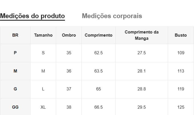 Disponível nos tamanhos: P, M, G, e GG, garantindo o ajuste perfeito para cada tipo de corpo.