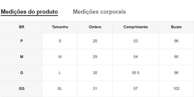 Disponível no tamanho: P, M, G e GG, garantindo o ajuste perfeito para cada tipo de corpo.