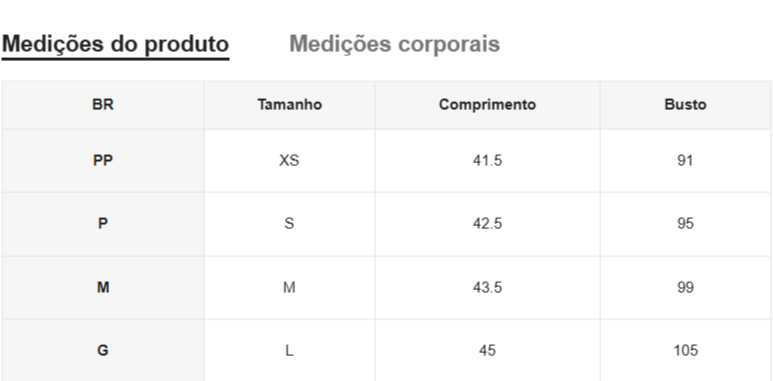 Disponível nos tamanhos: PP, P, M e G, garantindo o ajuste perfeito para cada tipo de corpo.