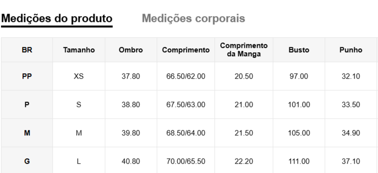 Disponível no tamanho: PP, P, M, e G, garantindo o ajuste perfeito para cada tipo de corpo.