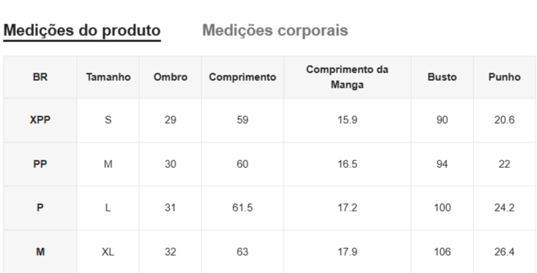 Disponível nos tamanhos: XPP, PP, P e M, garantindo o ajuste perfeito para cada tipo de corpo.