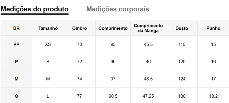 Disponível no tamanho PP, P, M e G, garantindo o ajuste perfeito para cada tipo de corpo.