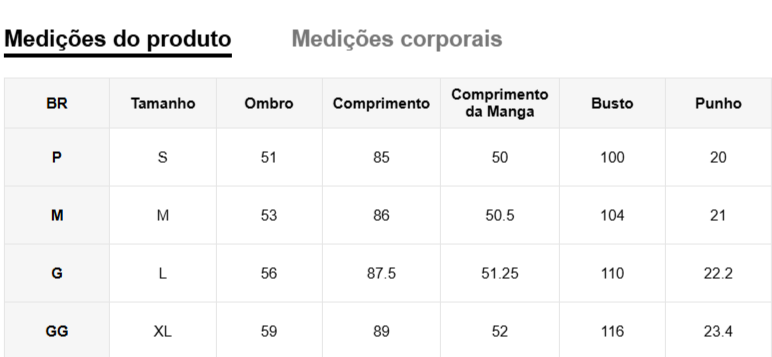 Disponível nos tamanhos PP, P, M, G, e GG, garantindo o ajuste perfeito para cada tipo de corpo.