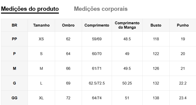 Disponível nos tamanhos PP, P, M, G, e GG, garantindo o ajuste perfeito para cada tipo de corpo.