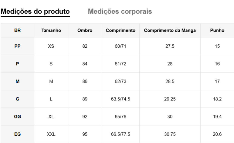 Disponível no tamanho PP, P, M, G, GG e EG, garantindo o ajuste perfeito para cada tipo de corpo.