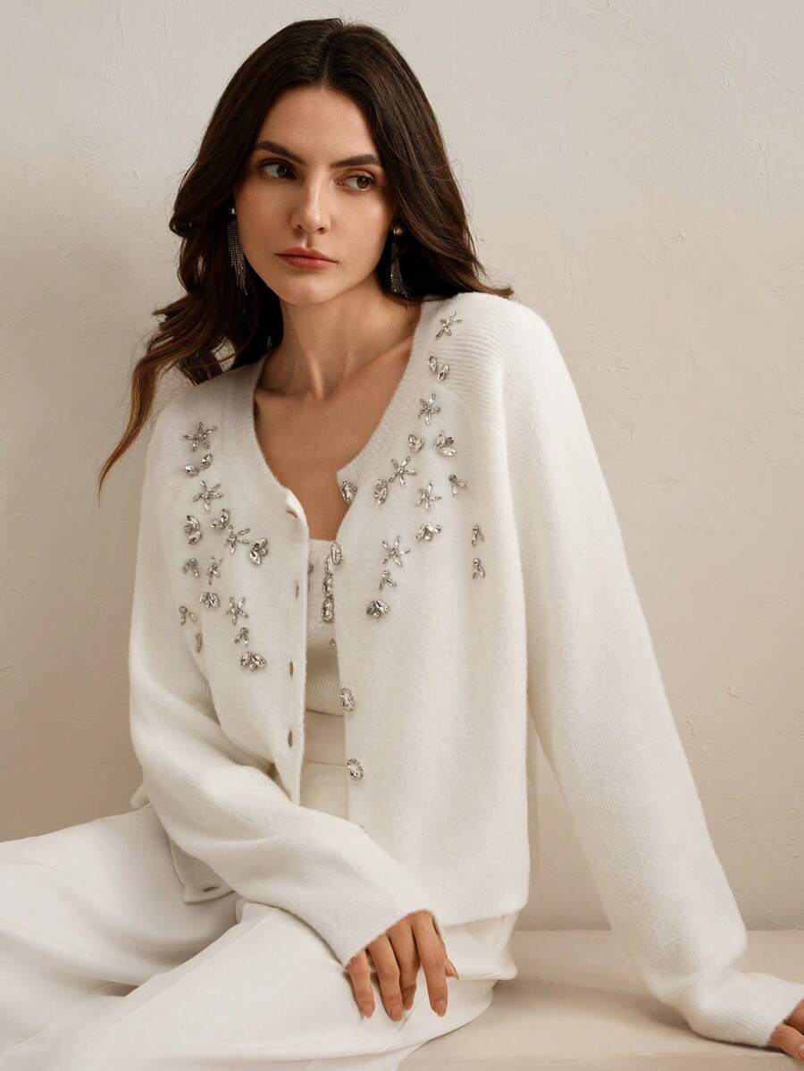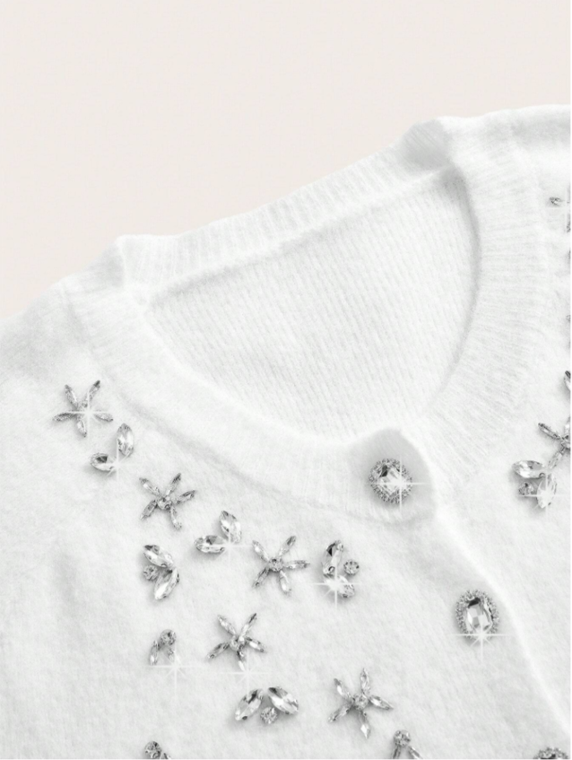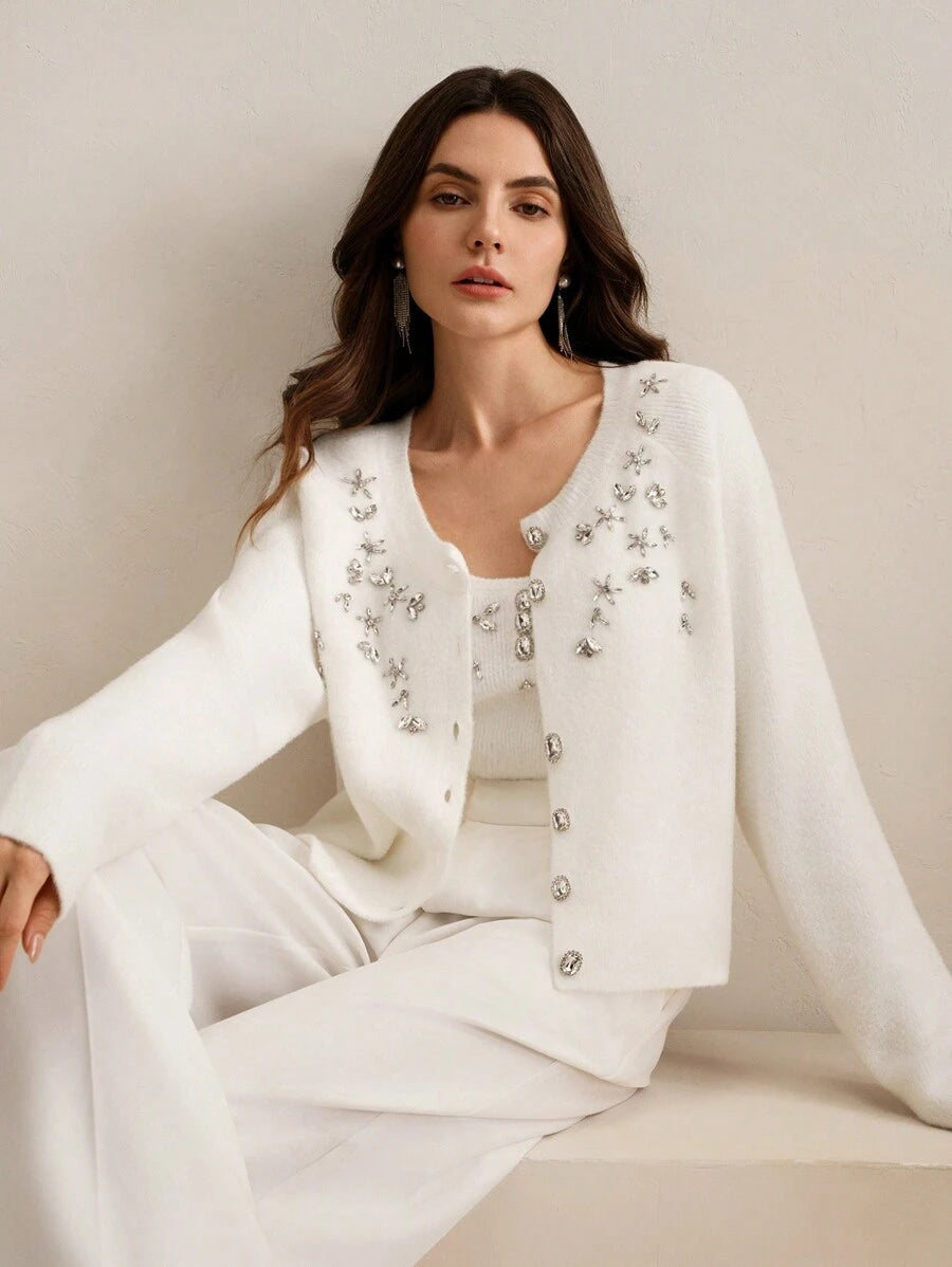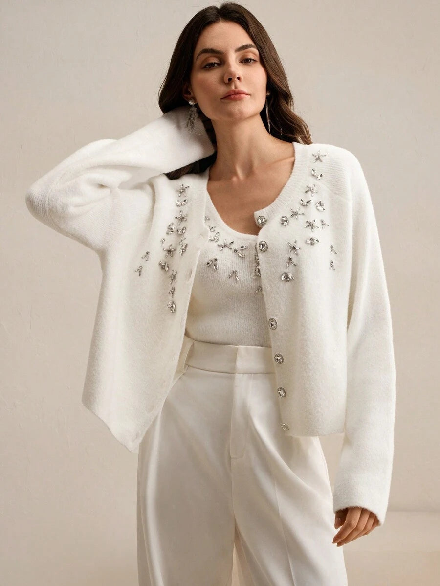 Design sofisticado, cardigã de mangas longas e detalhes de strass, combinando perfeitamente com a blusa sem mangas de gola de gola U e detalhes de stass. Acabamento impecável e detalhes que adicionam sofisticação ao seu visual. Não possui cinto.