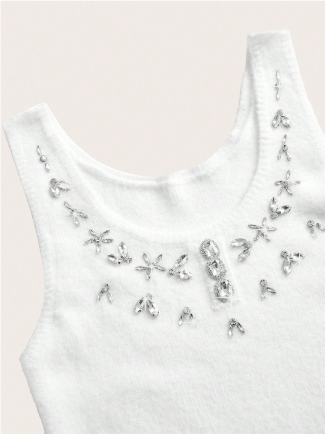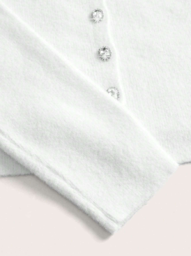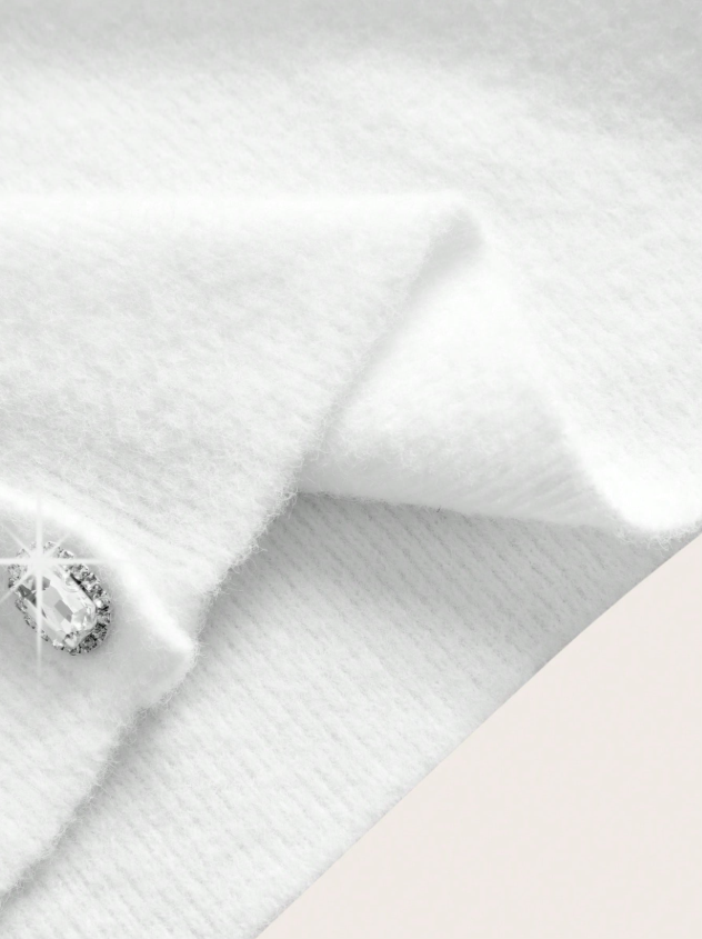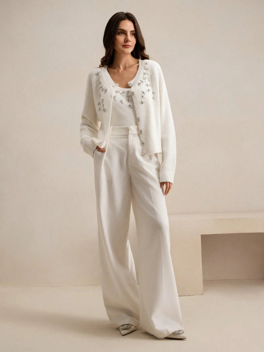 Design sofisticado, cardigã de mangas longas e detalhes de strass, combinando perfeitamente com a blusa sem mangas de gola de gola U e detalhes de stass. Acabamento impecável e detalhes que adicionam sofisticação ao seu visual. Não possui cinto.