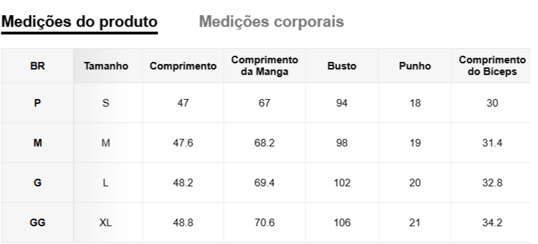 Disponível nos tamanhos P, M, G e GG, garantindo o ajuste perfeito para cada tipo de corpo.