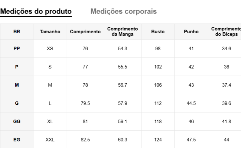 Disponível no tamanho PP, P, M, G, GG e EG, garantindo o ajuste perfeito para cada tipo de corpo.