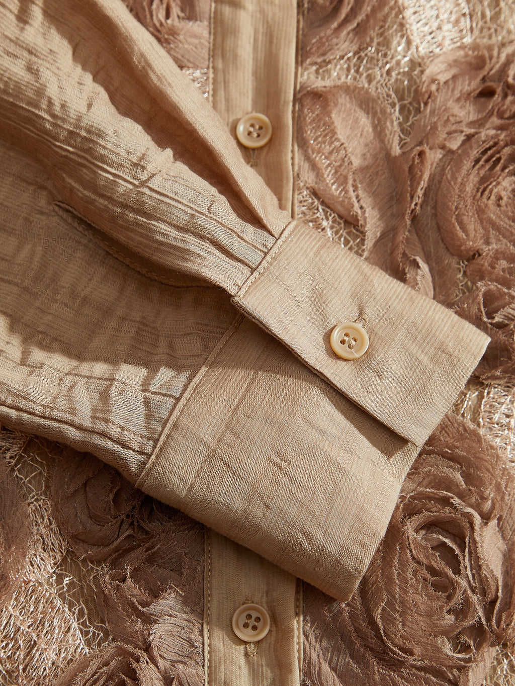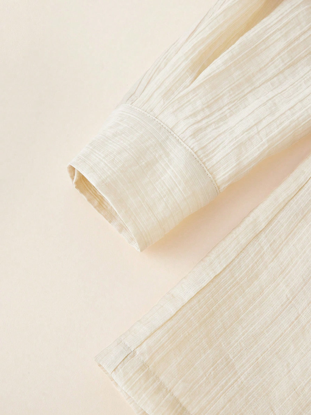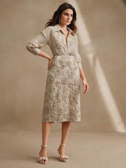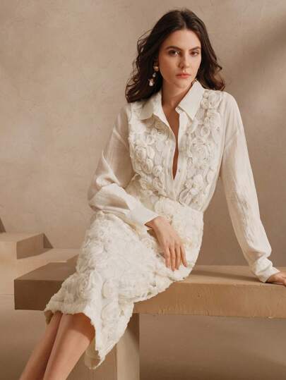 Design moderno e sofisticado, conjunto composto de uma camisa de gola lapela, botões funcionais e mangas longas de ombro caído, combinando perfeitamente com a saia abaixo do joelhos, modelo lápis, com zíper e uma fenda atrás. A peça é toda trabalhada em textura jacquard, enriquecendo o look. Acabamento impecável e detalhes que adicionam sofisticação ao seu visual.