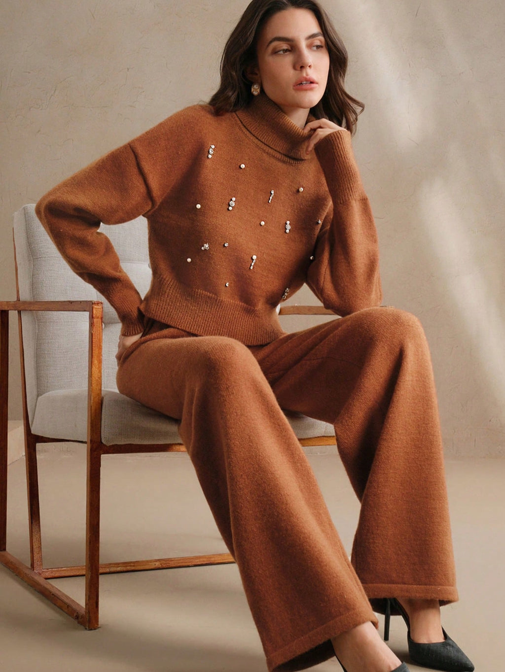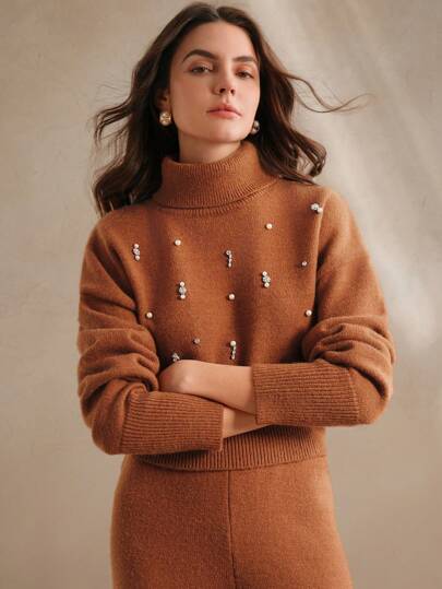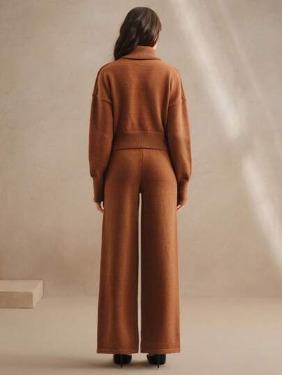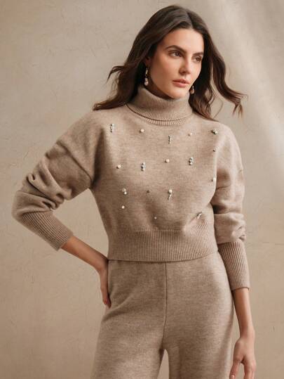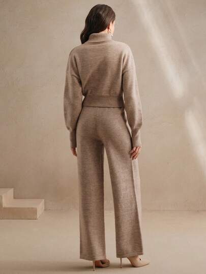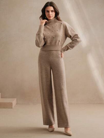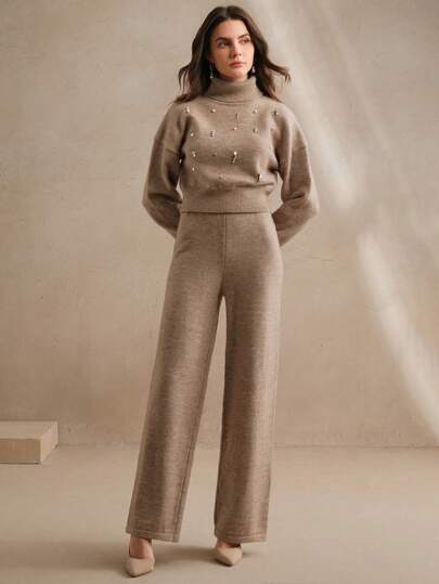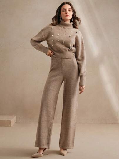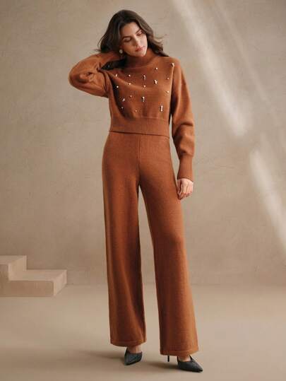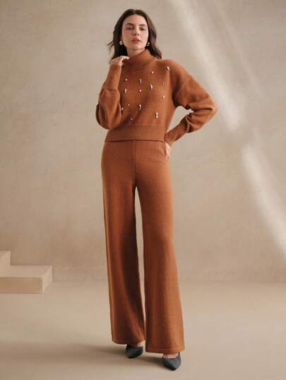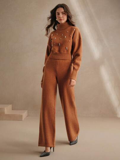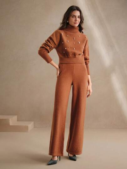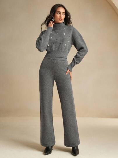 Design moderno e sofisticado, conjunto composto de um suéter tipo cropped de gola alta e mangas longas de ombro caído, combinando perfeitamente com a calça de corte reto e elástico na cintura. A peça possui strass no suéter, enriquecendo o look. Acabamento impecável e detalhes que adicionam sofisticação ao seu visual.
