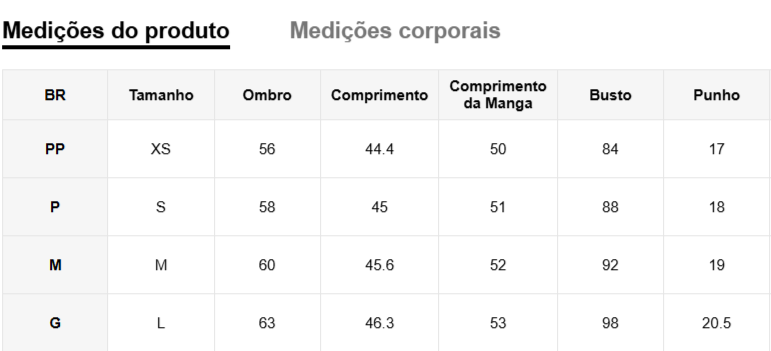 Disponível nos tamanhos PP, P, M e G, garantindo o ajuste perfeito para cada tipo de corpo.