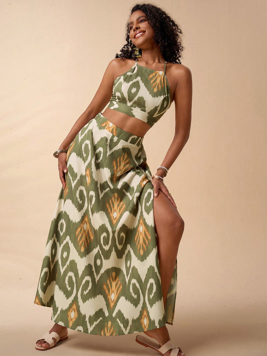 Design boêmio, cropped com alças espaguete ajustáveis cruzadas nas costas, tem também um laço para dar um charme ao look, combinando perfeitamente com a saia bem acinturada e com uma fenda do lado. Ideal para quem deseja transmitir feminilidade e se destacar em seu dia a dia. Acabamento impecável e detalhes que adicionam sofisticação ao seu visual.