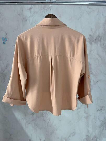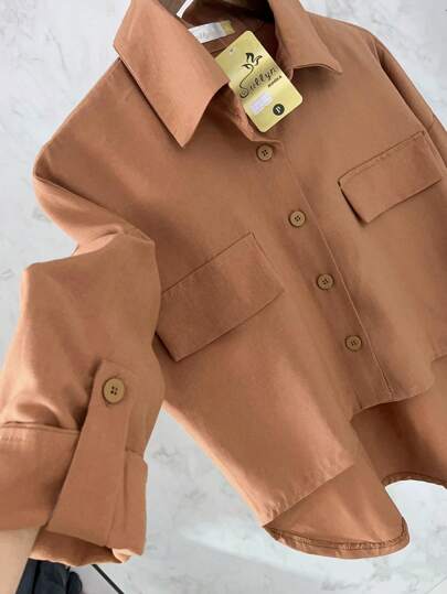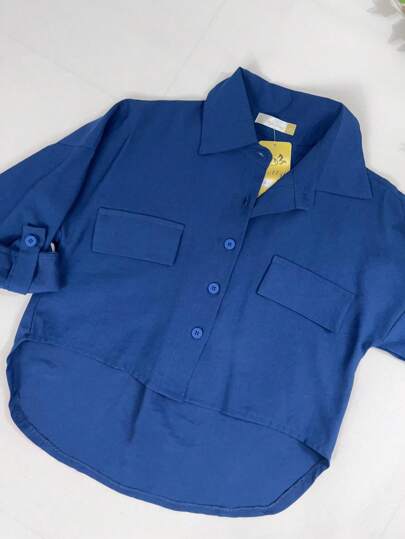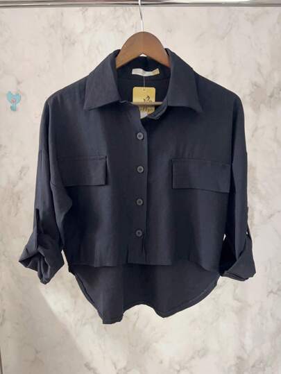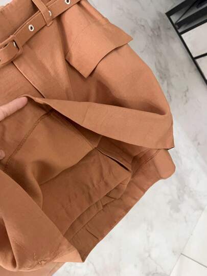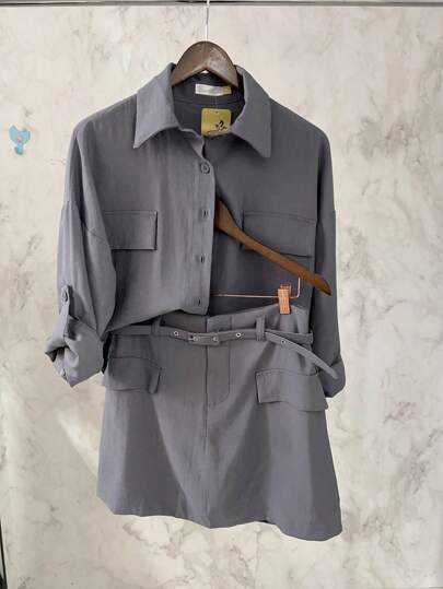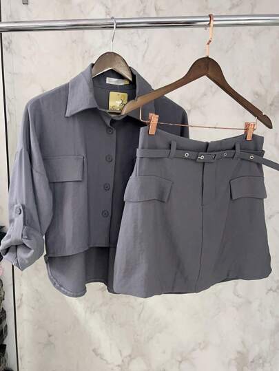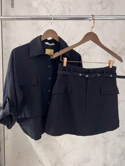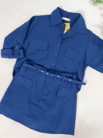 Design sofisticado, conjunto composto de uma camisa manga 3/4, gola lapela, botões funcionais e bolsos de enfeite, combinando perfeitamente com o shortsaia assimétrico, mais curto na frente e maior atrás, possui fechamento de zíper, cinto do tecido e bolsos de enfeite. Acabamento impecável e detalhes que adicionam sofisticação ao seu visual.