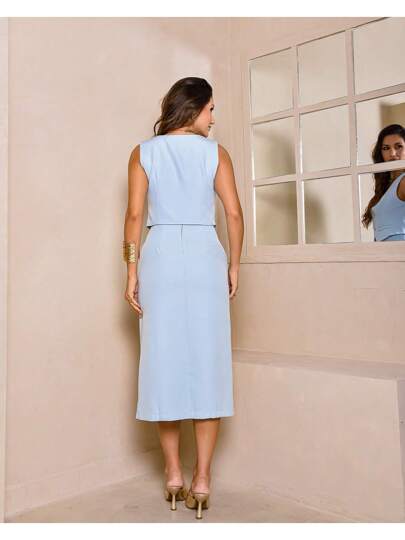 Design clássico, conjunto composto de um colete sem mangas, decote V, botões funcionais, bolsos de enfeite e corte assimétrico, combinando perfeitamente com a saia lápis midi, fechamento de zíper e fenda lateral. Acabamento impecável e detalhes que adicionam sofisticação ao seu visual.