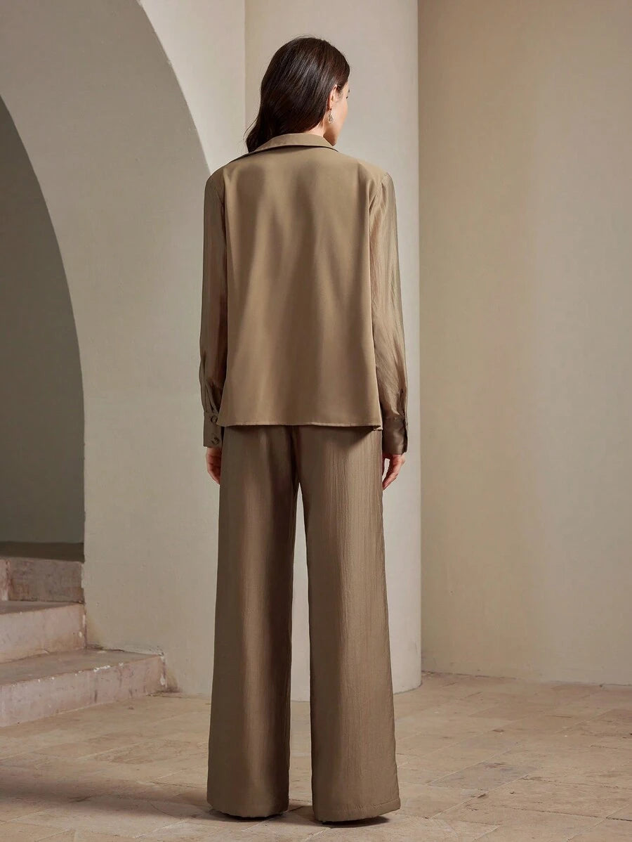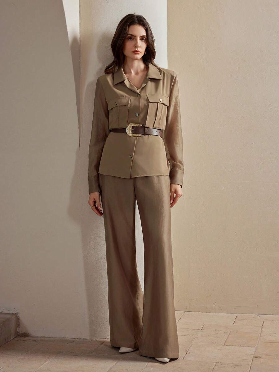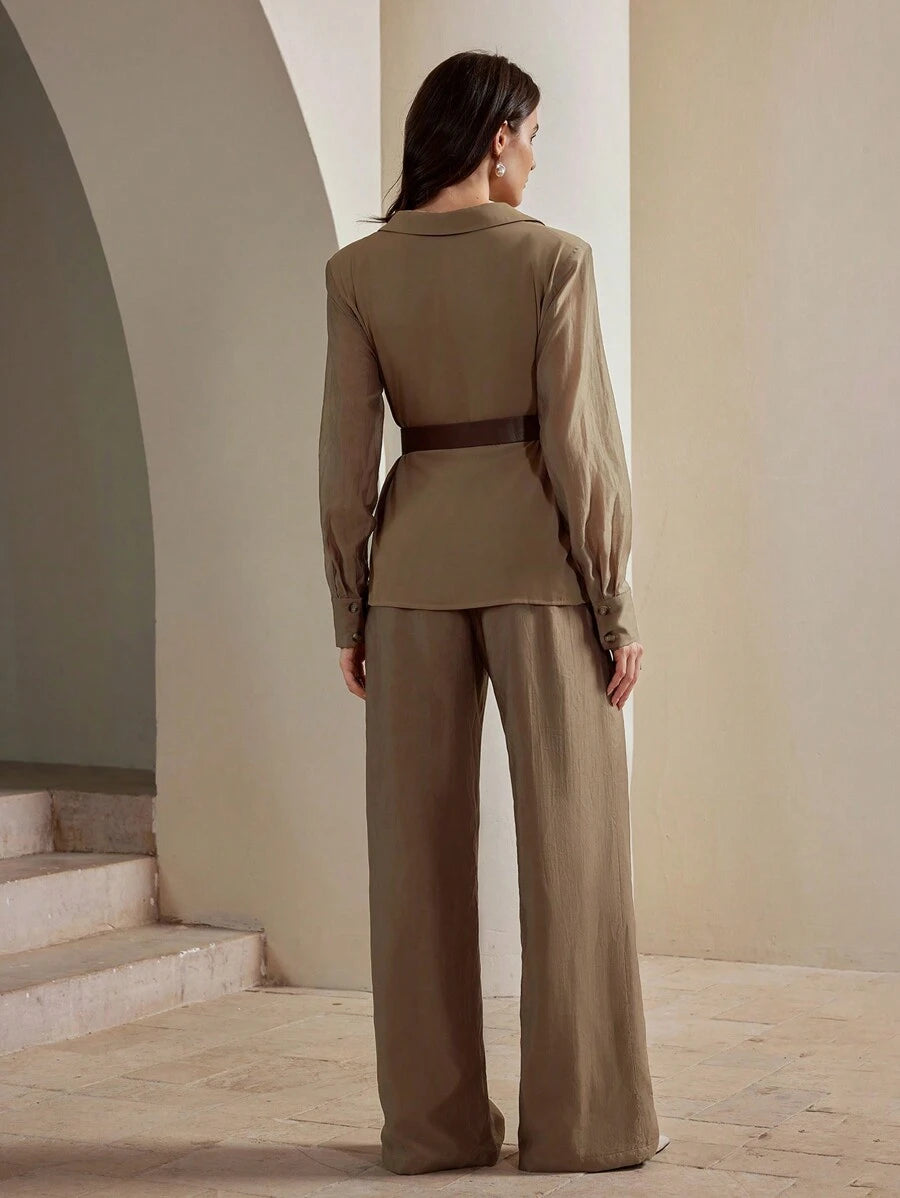 Design sofisticado, calça flare com elástico na cintura, combinando perfeitamente com a camisa de gola lapela e mangas longas com uma leve transparência. A peça possui bolsos frontais e botões funcionais, dando um ar de sofisticação ao visual. Acabamento impecável e detalhes que adicionam sofisticação ao seu visual. Não possui cinto.
