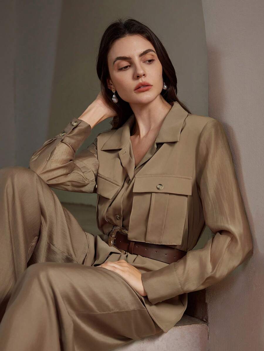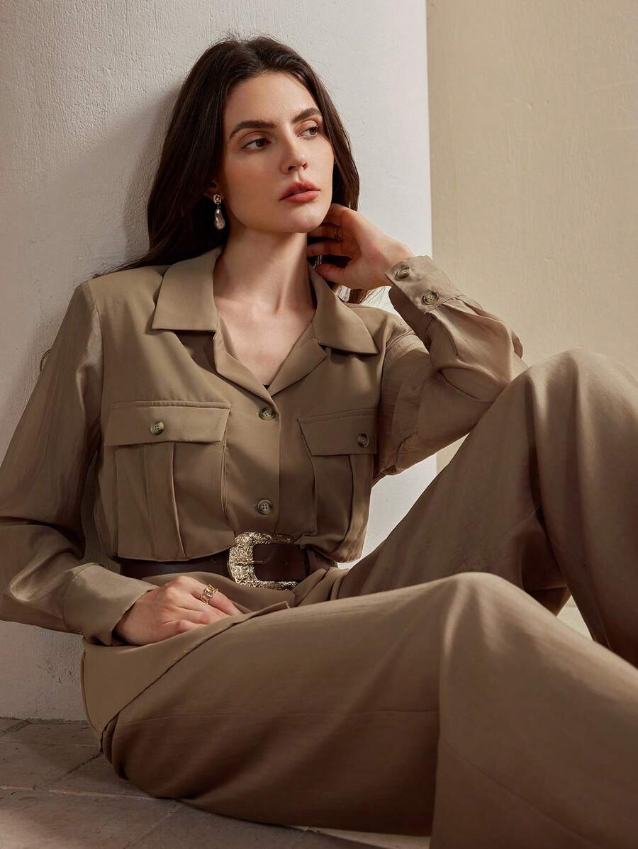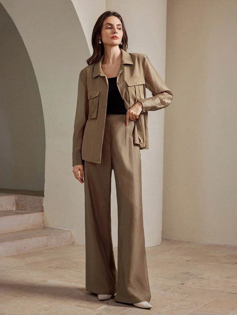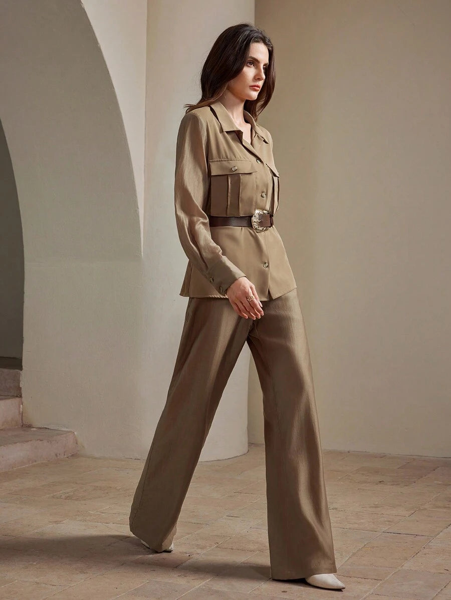 Design sofisticado, calça flare com elástico na cintura, combinando perfeitamente com a camisa de gola lapela e mangas longas com uma leve transparência. A peça possui bolsos frontais e botões funcionais, dando um ar de sofisticação ao visual. Acabamento impecável e detalhes que adicionam sofisticação ao seu visual. Não possui cinto.