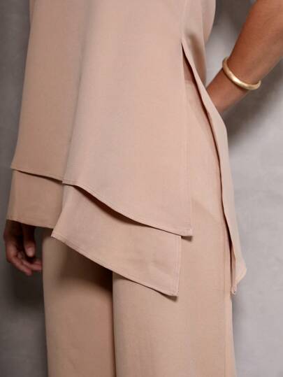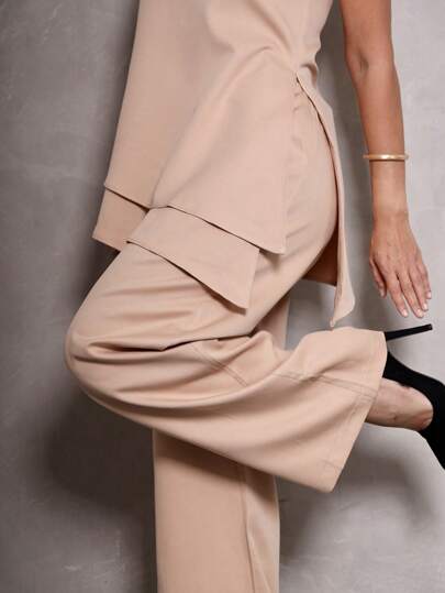 Design sofisticado, belíssimo conjunto, composto por uma blusa com alças espaguete reguláveis, corte assimétrico na barra e uma fenda lateral, dando um ar de sensualidade ao look, combinando perfeitamente com a calça de corte reto, bolsos e fechamento com botão. Acabamento impecável e detalhes que adicionam sofisticação ao seu visual. Não possui cinto.