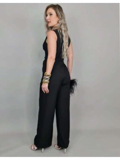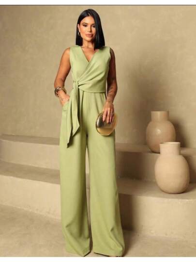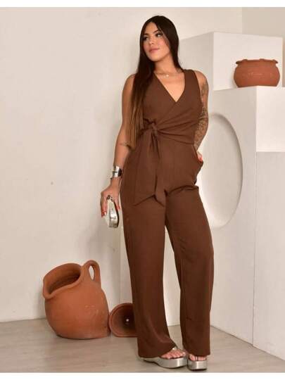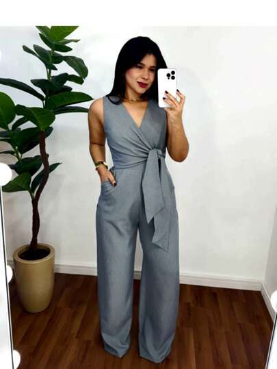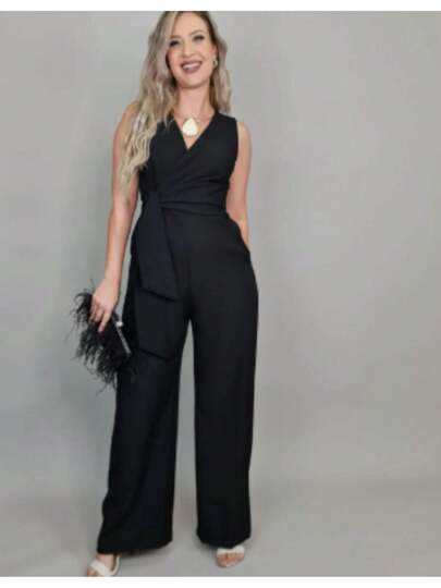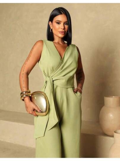 Design sofisticado e moderno, decote V transpassado formando um belíssimo laço na cintura, calça pantalona e bolsos funcionais. Acabamento impecável e detalhes que adicionam sofisticação ao seu visual.