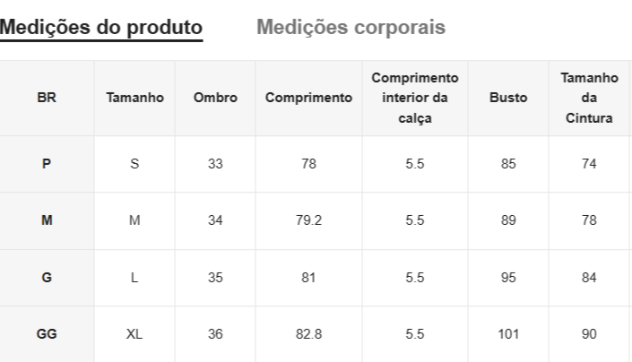 Disponível nos tamanhos P, M, G e GG, garantindo o ajuste perfeito para cada tipo de corpo.
