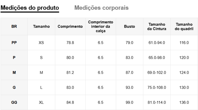 Disponível nos tamanhos PP, P, M, G e GG, garantindo o ajuste perfeito para cada tipo de corpo.