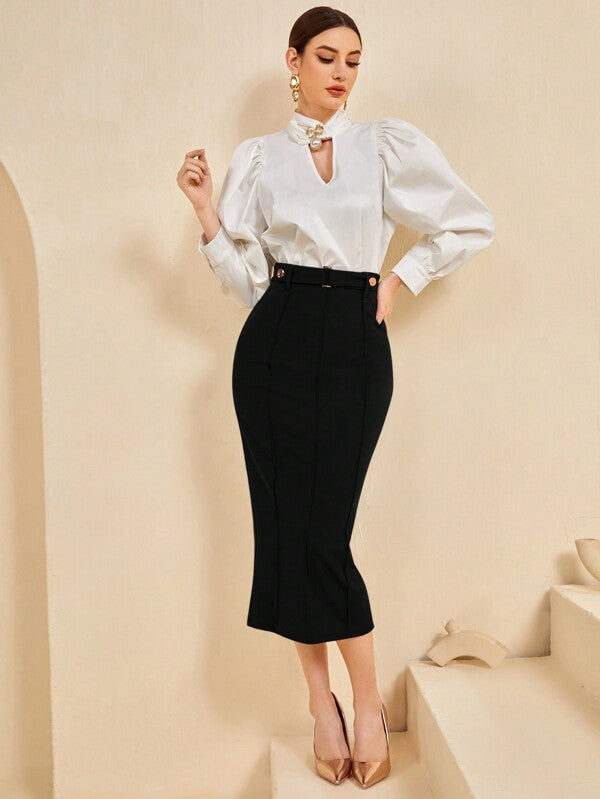 Design clássico, estilo lápis, fechamento com zíper, fenda atrás, cintura alta e um belíssimo botão de enfeite na cintura, dando um ar de sofisticação ao look. Acabamento impecável e detalhes que adicionam sofisticação ao seu visual.