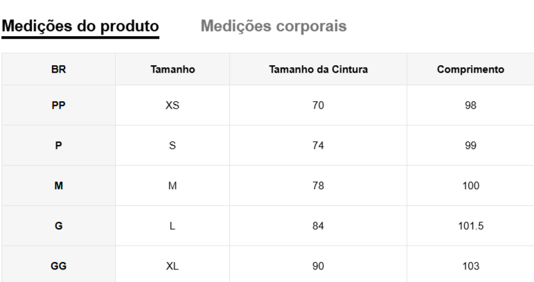 Disponível nos tamanhos PP, P, M, G e GG, garantindo o ajuste perfeito para cada tipo de corpo.