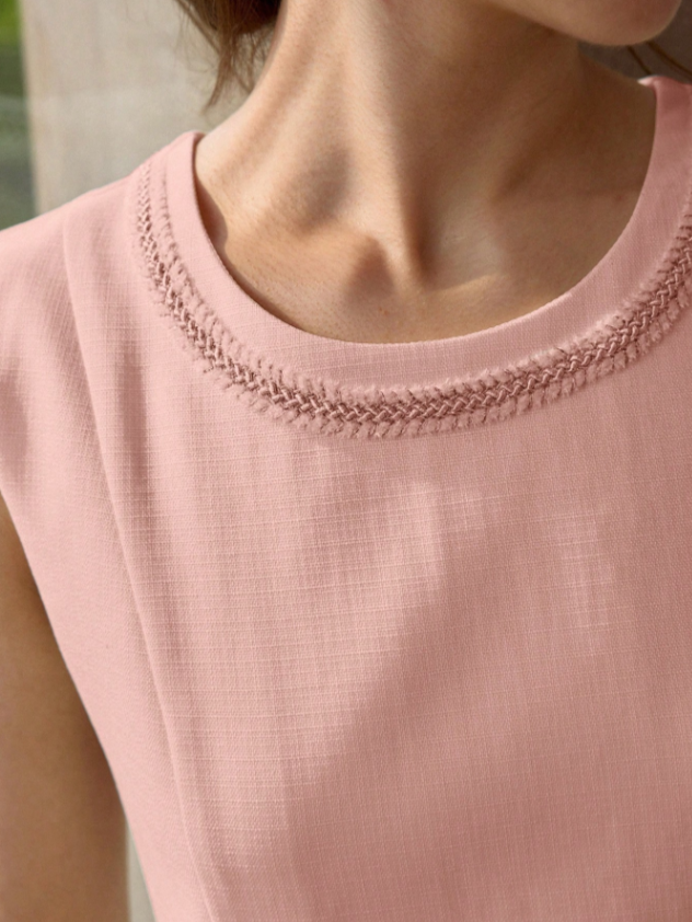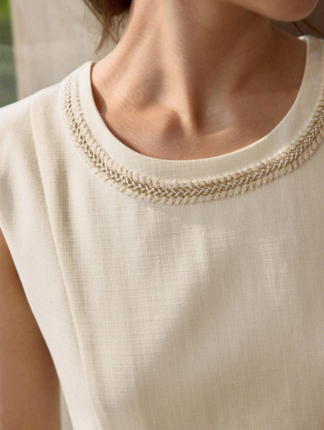 Design clássico, sem mangas, estilo regata, gola redonda com um belíssimo detalhe na gola e nos bolsos de enfeite, possui também um cinto que dá ao look um ar clássico e romântico, fechamento com zíper e botão. Ideal para quem deseja transmitir feminilidade e se destacar em seu dia a dia. Acabamento impecável e detalhes que adicionam sofisticação ao seu visual.