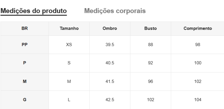 Disponível no tamanho PP, P, M e G, garantindo o ajuste perfeito para cada tipo de corpo.