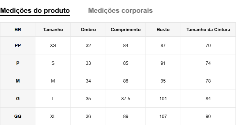 Disponível nos tamanhos PP, P, M, G e GG, garantindo o ajuste perfeito para cada tipo de corpo.