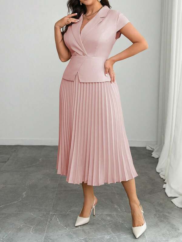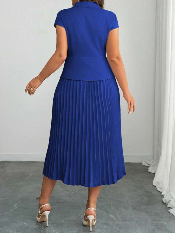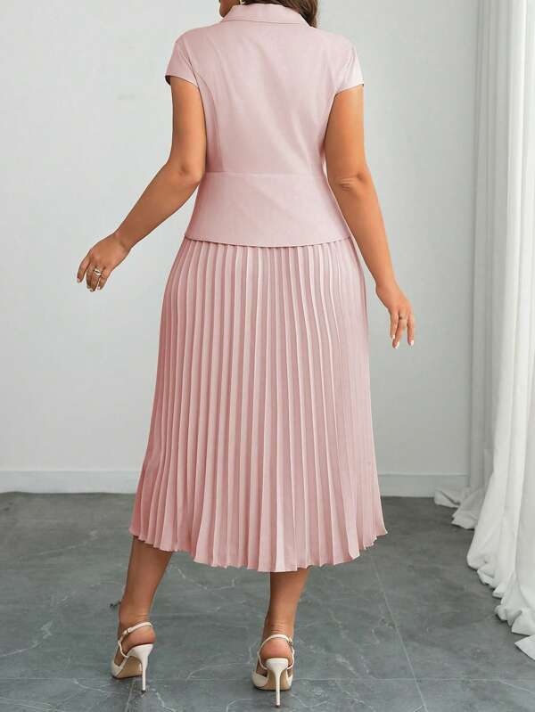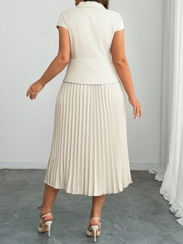 Design sofisticado, evasê, decote V com colarinho de blazer, mangas curtas, cruzado com belíssimos botões de enfeite, possui a saia plissada, enriquecendo o look. Ideal para quem deseja transmitir beleza e sofisticação em qualquer ocasião. Acabamento impecável e detalhes que adicionam sofisticação ao seu visual.