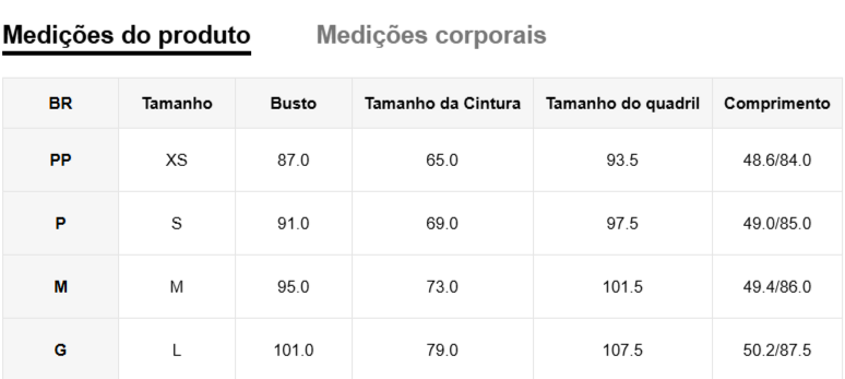 Disponível no tamanho PP, P, M e G, garantindo o ajuste perfeito para cada tipo de corpo.