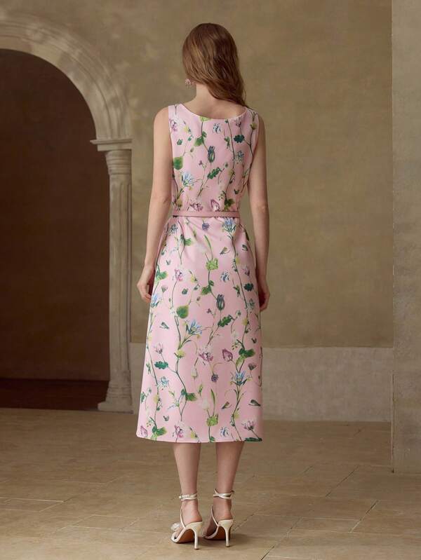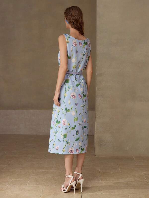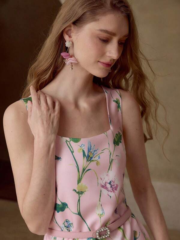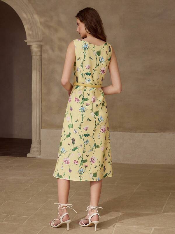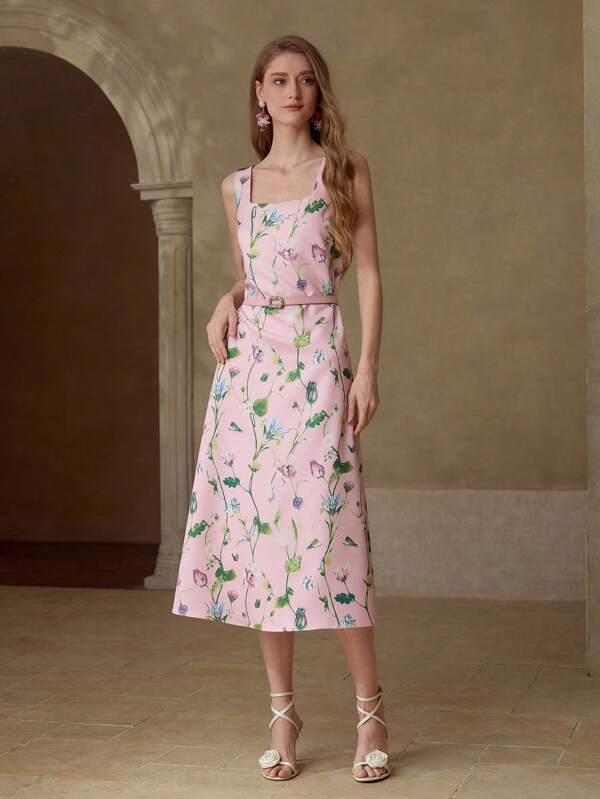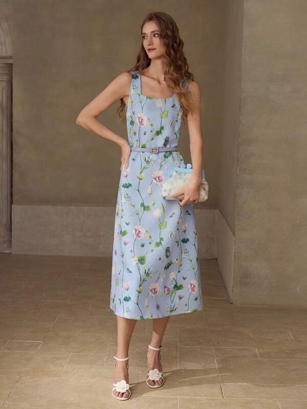 Design clássico e romântico, vestido evasê todo forrado, sem mangas, decote quadrado e um cinto combinando com o tecido e a cor do vestido para valorizar a silhueta. Acabamento impecável e detalhes que adicionam sofisticação ao seu visual.