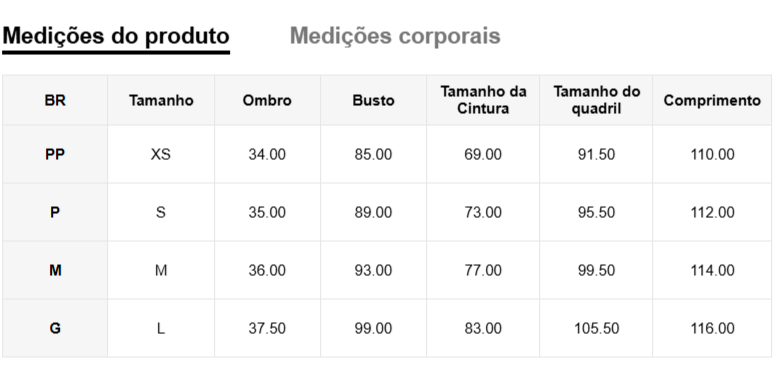 Disponível nos tamanhos PP, P, M e G, garantindo o ajuste perfeito para cada tipo de corpo.
