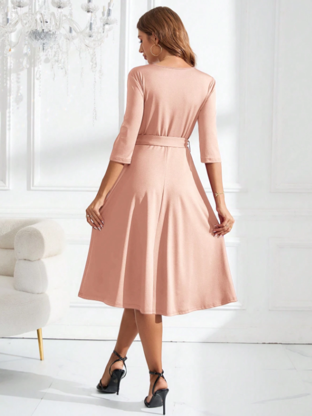 Design clássico e elegante, tipo evasê, com gola redonda e mangas 3/4. Possui um belíssimo cinto da cor do tecido para valorizar a silhueta. Ideal para quem deseja transmitir elegância e se destacar em seu dia a dia. Acabamento impecável e detalhes que adicionam sofisticação ao seu visual.