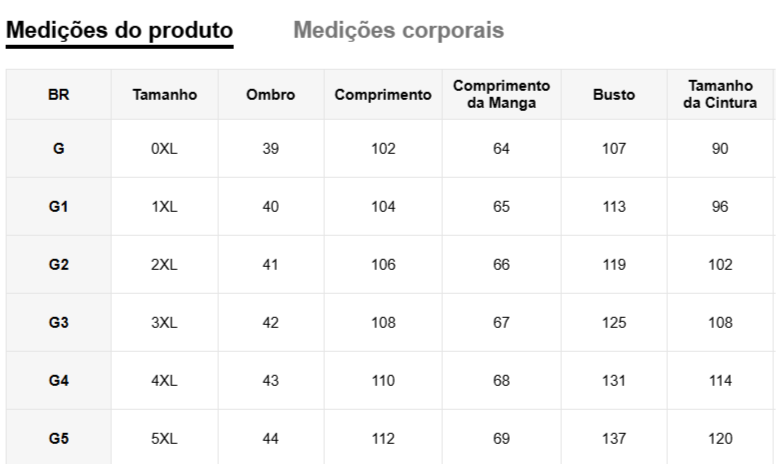 Disponível nos tamanhos G0, G1, G2, G3, G4 e G5, garantindo o ajuste perfeito para cada tipo de corpo.